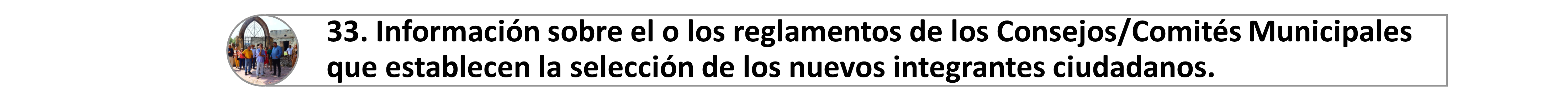 33. Información sobre el o los reglamentos de los Consejos/Comités Municipales establece que la selección de los nuevos integrantes ciudadanos debe realizarse a mitad del periodo de gobierno o de forma escalonada o que el cambio no se dé al inicio de la Administración. Lo anterior para garantizar y/o asegurar la continuidad de los trabajos