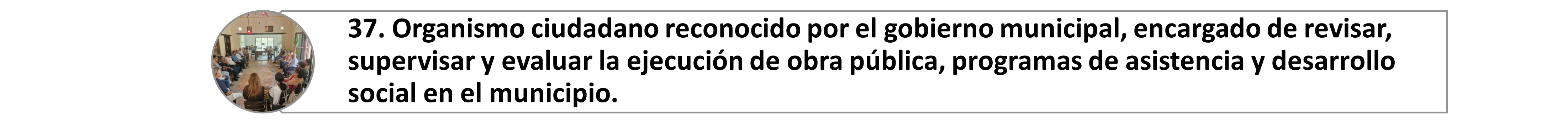 37. El gobierno municipal tiene a la vista de toda persona en formato abierto, accesible y electrónico información sobre si el gobierno municipal tiene un organismo ciudadano (comités de vigilancia, contraloría social u otro organismo ciudadano), reconocido por el gobierno municipal, encargado de revisar, supervisar y evaluar la ejecución de obra pública, programas de asistencia y desarrollo social en el municipio.